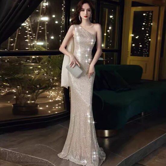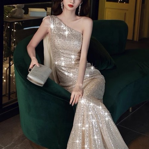 演奏会ドレス レディース ワンショルダー ロングドレス スパンコール ビジュー スリム タイト ロング丈 マキシ丈 結婚式 発表会 ステージ衣装 パーティー イブニングドレス 華やか エレガント