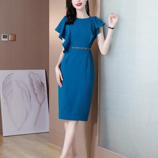結婚式ドレス レディース タイトワンピース フリル ラウンドネック ミディアム丈 ミモレ丈 ひざ丈 アシンメトリー フリル袖 半袖 演奏会 発表会 披露宴 二次会 パーティー きれいめ エレガント
