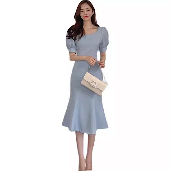 結婚式ドレス ソリッドカラー スリム スクエアネック 無地 シンプル ミモレ丈 発表会 演奏会 レディース 結婚式 ステージ衣装 エレガント パフスリーブ カラードレス イブニングドレス