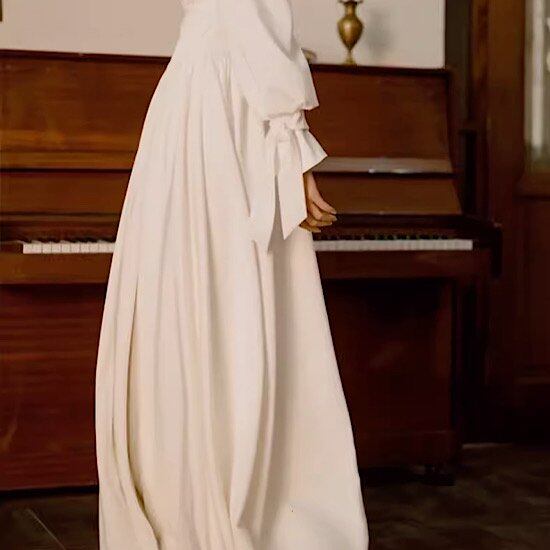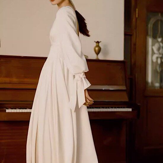 結婚式ドレス フレンチ 長袖 ウエストマーク ロング丈 無地 シンプル ハイウエスト 発表会 演奏会 レディース 結婚式 ステージ衣装 エレガント ウエディングドレス カラードレス イブニングドレス
