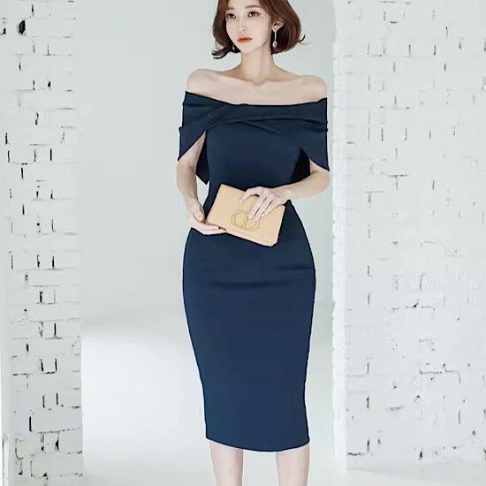 結婚式ドレス オフショルダー セクシー タイト 無地 シンプル ミモレ丈 発表会 演奏会 レディース 結婚式 ステージ衣装 エレガント ウエディングドレス カラードレス イブニングドレス