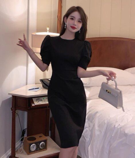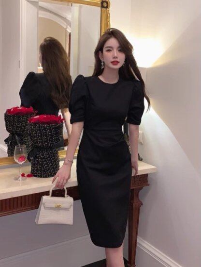 結婚式ドレス レディース パフスリーブ 半袖 タイトワンピース ラウンドネック シンプル 無地 ミディアム丈 ミモレ丈 ひざ丈 黒 ブラック 演奏会 披露宴 二次会 パーティードレス エレガント