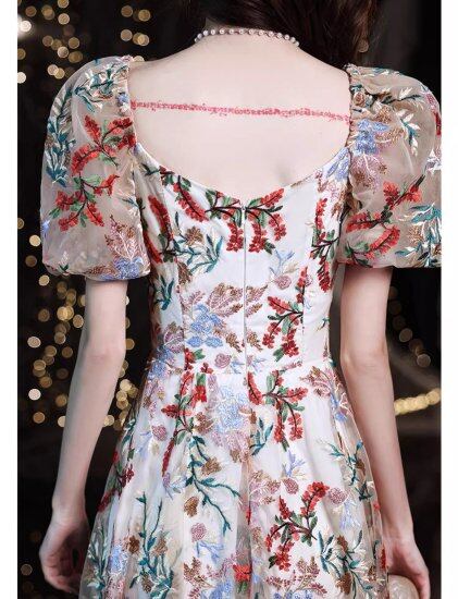 結婚式ドレス レディース 花柄 刺繍 パフスリーブ バルーンスリーブ ハートネック Vネック ミディアム丈 ミモレ丈 演奏会 披露宴 二次会 謝恩会 パーティー イブニングドレス エレガント 華やか