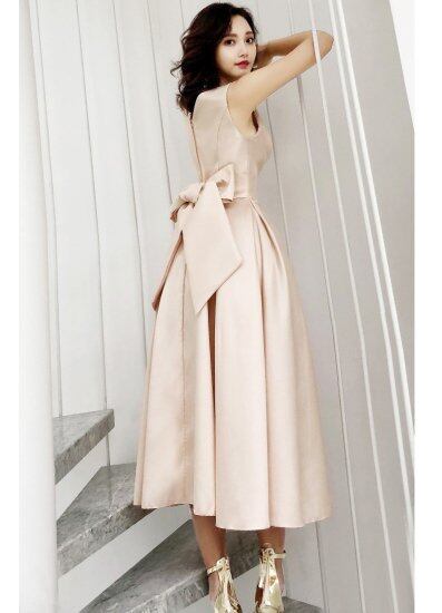 結婚式ドレス レディース Vネック スタンドカラー リボン Aラインワンピース ミディアム丈 ミモレ丈 無地 フレア 演奏会 二次会 披露宴 謝恩会 パーティー イブニングドレス 上品 エレガント