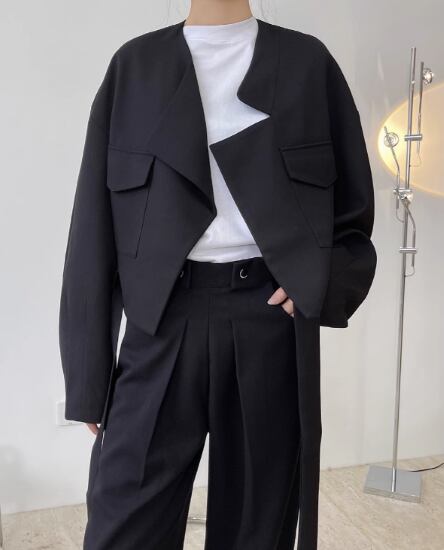 ショートコート レディース アウター コート ショート丈 羽織 ウエストベルト スーツ襟 ゆったり ルーズシルエット カジュアル お出かけ おしゃれ きれいめ エレガント 無地 ポケット ファッション