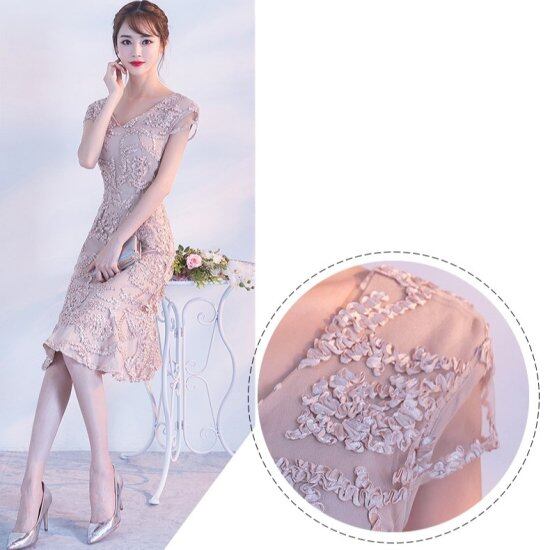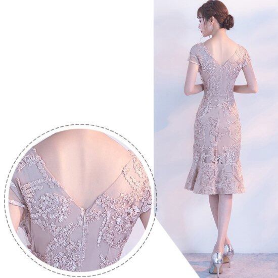結婚式ドレス レディース Vネック マーメイド フレンチスリーブ ミディアム丈 ひざ丈 花柄 フィッシュテール タイト ワンピース 演奏会 二次会 謝恩会 パーティードレス 華やか エレガント