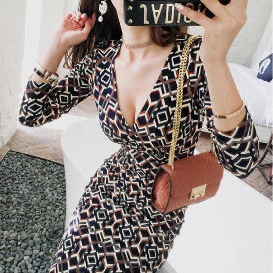 ワンピース レディース Vネック ジオメトリック 幾何学模様 タイトワンピース スリム 長袖 ミモレ丈 ロング丈 プリントワンピース クール セクシー エレガント オフィス パーティードレス
