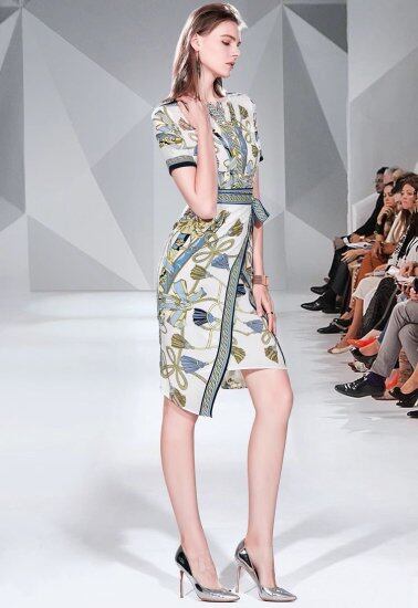 ワンピース レディース スカーフ柄 タイトワンピース 巻きスカート風 ラップスカート ひざ丈 ミディアム丈 半袖 ラウンドネック プリントワンピース レトロ クラシカル パーティー エレガント