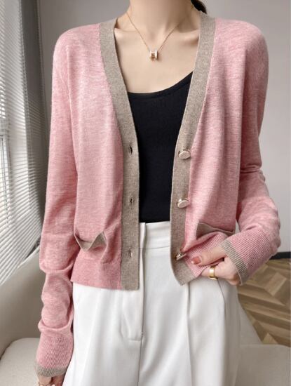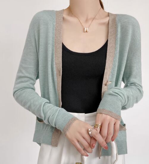 ニットカーディガン レディース 羽織 カーディガン 長袖 Vネック ニット ウール シングルブレスト フロントボタン 配色デザイン カジュアル お出かけ おしゃれ きれいめ エレガント 無地 女性