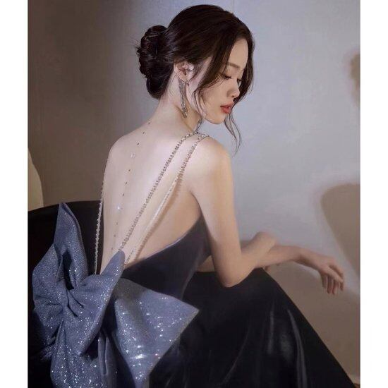 演奏会ドレス レディース リボン バックオープン ノースリーブ ベアトップ 背中あき ロングドレス マキシ丈 スリム セクシー エレガント 結婚式 二次会 ステージ衣装 パーティー イブニングドレス