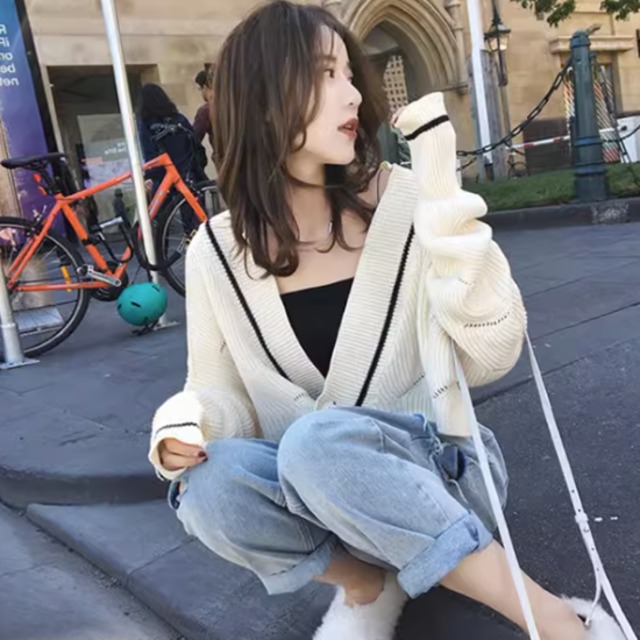 ニットカーディガン レディース 羽織 トップス カーディガン 長袖 ニット セーター ショート丈 クロップド丈 長袖カーディガン Vネック コントラストカラー ラインデザイン バイカラー 女性 ボタン