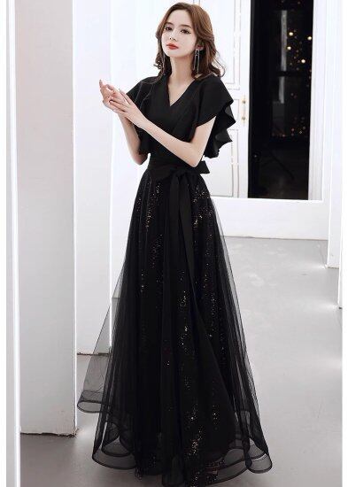 結婚式ドレス レディース フリル Vネック リボン ハイウエスト レース ボリューム袖 フリルスリーブ 透け感 シアー 演奏会 二次会 披露宴 ステージ衣装 パーティー イブニングドレス エレガント