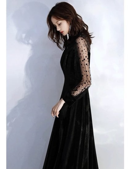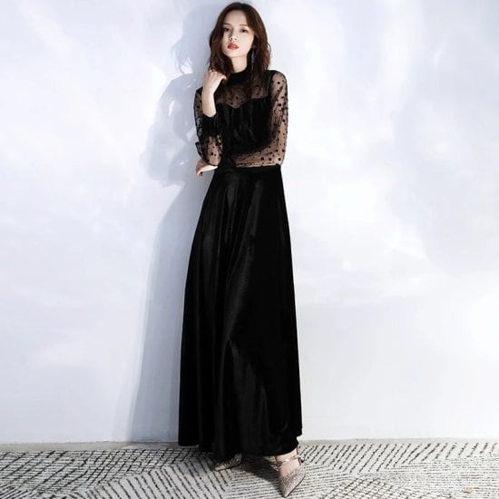 結婚式ドレス レディース ロングドレス ドット柄 水玉 シースルー シアー スタンドカラー 長袖 透け感 ロング丈 マキシ丈 演奏会 二次会 披露宴 パーティー イブニングドレス エレガント