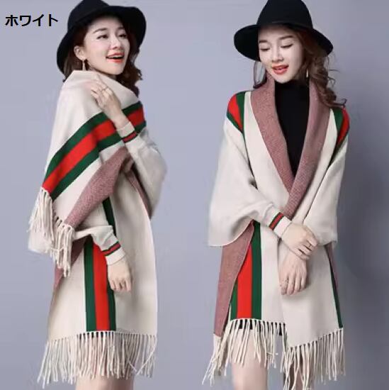 ショール風コート レディース アウター 羽織 ポンチョ ケープ コート フリンジ 配色デザイン ラインデザイン カジュアル お出かけ おしゃれ きれいめ エレガント 秋冬 女性 ファッション 暖かい