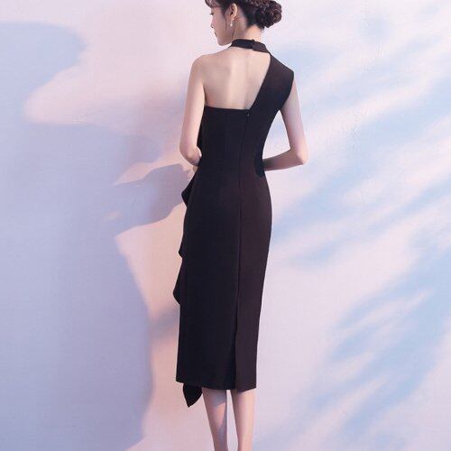 キャバドレス パーティー 発表会 タイト フリル アシンメトリー ミモレ丈 黒 白 バックコンシャス ノースリーブ セクシー キャバドレス パーティー 発表会 タイト フリル アシンメトリー ミモレ丈