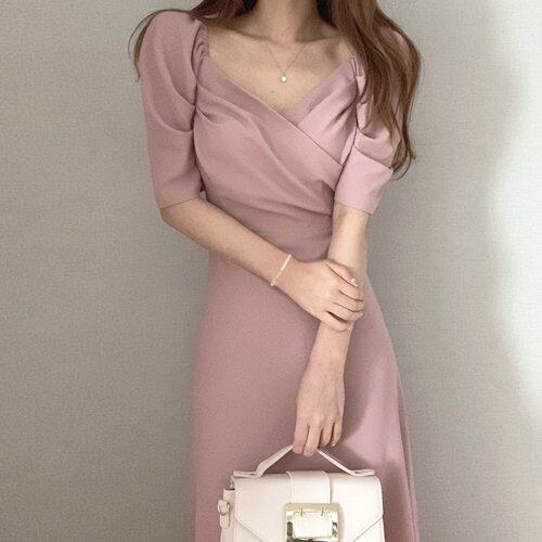 パーティードレス お呼ばれ 結婚式 二次会 パーティー パフスリーブ カシュクール 白 ミモレ丈 五分袖 無地 パーティードレス お呼ばれ 結婚式 二次会 パーティー パフスリーブ カシュクール 白