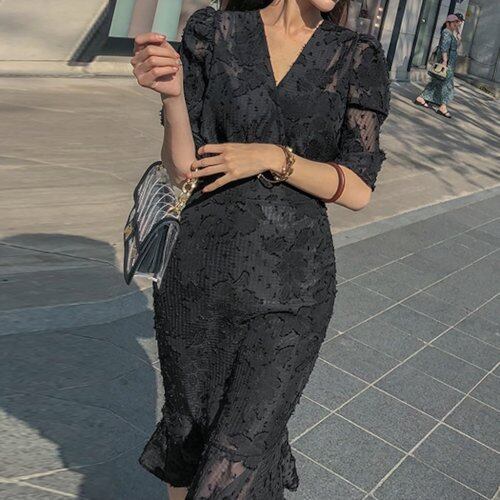 パーティードレス 総レース カシュクール マーメイド 黒 五分袖 Vネック タイト 大きいサイズ お呼ばれ パーティー 発表会 同窓会 パーティードレス 総レース カシュクール マーメイド 黒 五分袖