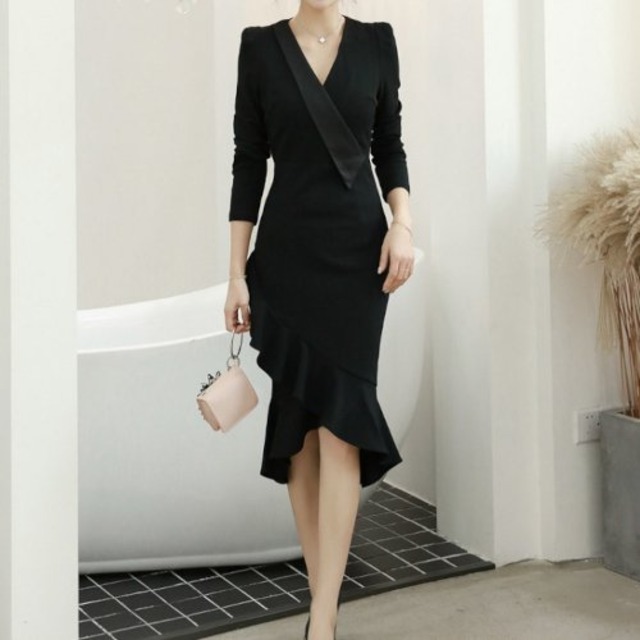 パーティードレス 結婚式 二次会 お呼ばれ 同窓会 謝恩会 発表会 ミモレ丈 黒 ワンピース 長袖 マーメイド フリル アシンメトリー Vネック パーティードレス 結婚式 二次会 お呼ばれ 同窓会