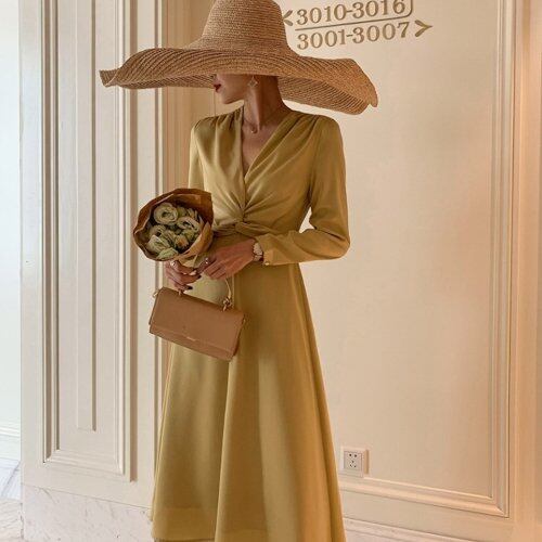 パーティードレス 結婚式 二次会 お呼ばれ 発表会 演奏会 同窓会 パーティー サテン生地 長袖 ミモレ丈 フレア Vネック 大きいサイズ エレガント フェミニン パーティードレス 結婚式 二次会