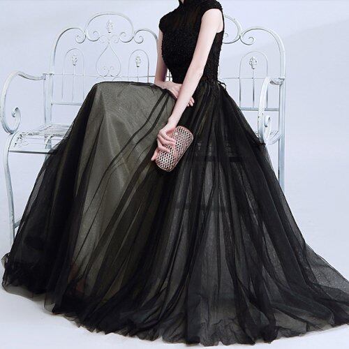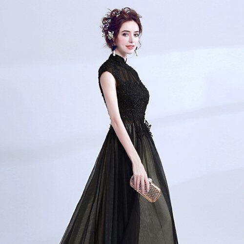 演奏会ドレス 結婚式 二次会 発表会 お呼ばれ パーティー ノースリーブ 刺繍 ロングドレス 黒 シースルー 大きいサイズ Aライン エレガント フェミニン 演奏会ドレス 結婚式 二次会 発表会