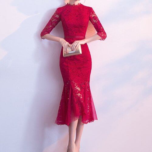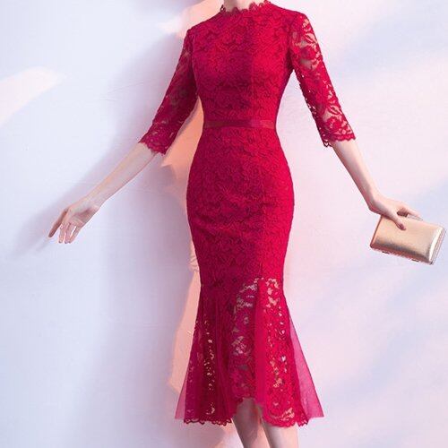 パーティードレス 結婚式 二次会 発表会 パーティー お呼ばれ 総レース マーメイド フリル 五分袖 大きいサイズ エレガント ミモレ丈 フェミニン ワンピース 黒 パーティードレス 結婚式 二次会