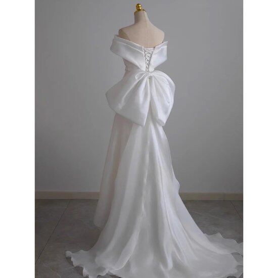 ウェディングドレス レディース オフショルダー バックリボン Aライン フィッシュテール Vネック カシュクール ショール 肩出し シンプル 演奏会 パーティー イブニングドレス 上品 エレガント