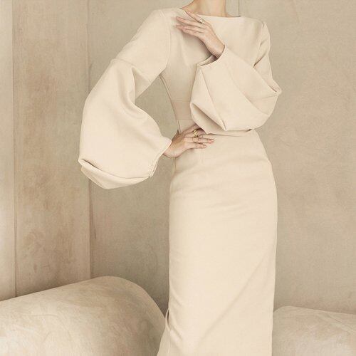 パーティードレス 結婚式 二次会 お呼ばれ 発表会 パーティー ミモレ丈 タイトワンピース ボートネック ボリューム袖 長袖 無地 エレガント 個性的 パーティードレス 結婚式 二次会 お呼ばれ