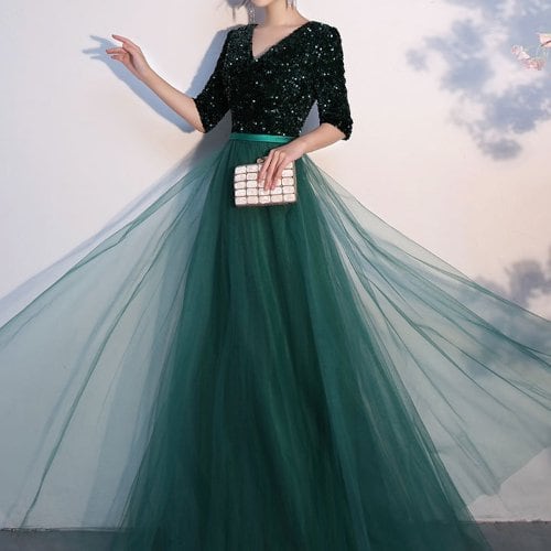 演奏会ドレス 発表会 お呼ばれ パーティー 結婚式 二次会 Vカット スパンコール Aライン マキシ丈 エレガント 五分袖 大きいサイズ 演奏会ドレス 発表会 お呼ばれ パーティー 結婚式 二次会