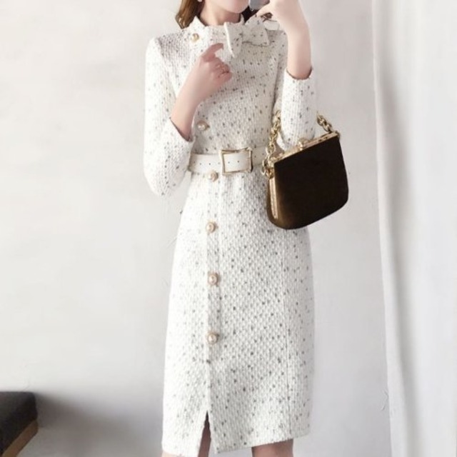 パーティードレス 結婚式 パーティー お呼ばれ 同窓会 謝恩会 発表会 ツイード フォーマル タイトワンピース 長袖 リボン 大きいサイズ パール 膝上 エレガント 大きいサイズ パーティードレス