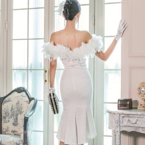 パーティードレス 結婚式 二次会 発表会 お呼ばれ パーティー ワンピース 黒 白 マーメイド ファー オフショルダー 大きいサイズ タイトドレス パーティードレス 結婚式 二次会 発表会 お呼ばれ