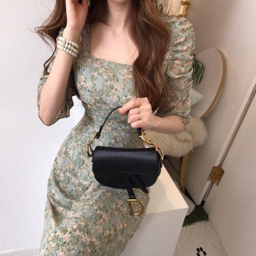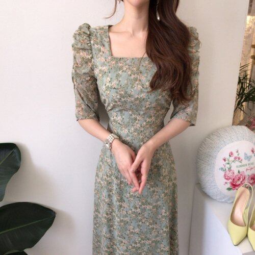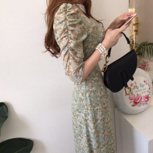パーティードレス 結婚式 二次会 発表会 お呼ばれ ミモレ丈 ワンピース 花柄 七分袖 スクエアネック ギャザー パーティードレス 結婚式 二次会 発表会 お呼ばれ ミモレ丈 ワンピース 花柄 七分袖