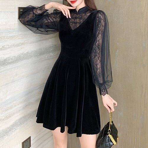 パーティードレス 結婚式 二次会 発表会 お呼ばれ パーティー ランタンスリーブ シースルー レース ベルベット ミニワンピース 黒 大きいサイズ フレアワンピース パーティードレス 結婚式 二次会
