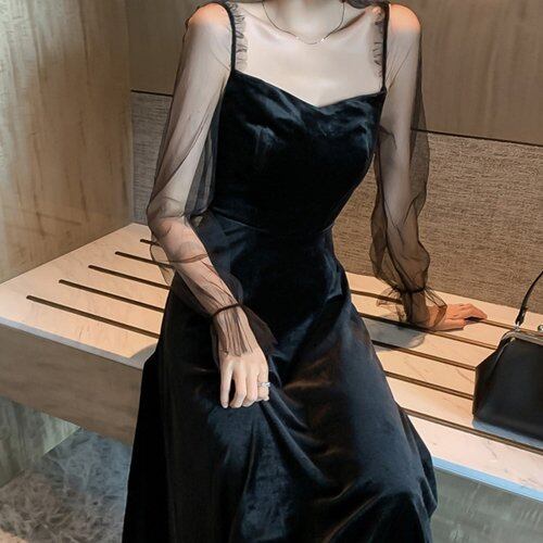 パーティードレス 結婚式 二次会 お呼ばれ パーティー ミモレ丈ワンピース 黒 ベルベット シースルー 異素材 バックシャン フレアワンピース パーティードレス 結婚式 二次会 お呼ばれ パーティー
