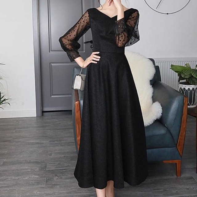 パーティードレス 結婚式 二次会 お呼ばれ 発表会 パーティー ミモレ丈 黒 シースルー ドット柄 Vネック フレアワンピース 大きいサイズ エレガント パーティードレス 結婚式 二次会 お呼ばれ