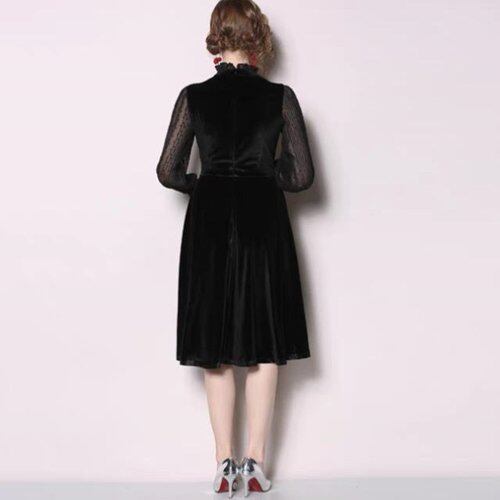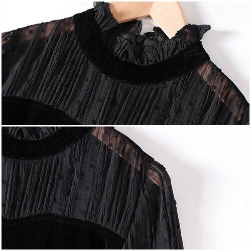 パーティードレス 結婚式 二次会 同窓会 謝恩会 お呼ばれ 膝丈 ワンピース 黒 長袖 シースルー フリル ドット柄 ベルベット素材 フレア 異素材 パーティードレス 結婚式 二次会 同窓会 謝恩会