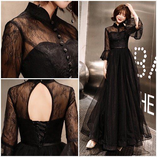 パーティードレス 結婚式 演奏会 発表会 ロングドレス 黒 シースルー 七分袖 ベルスリーブ バックシャン 大きいサイズ パーティードレス 結婚式 演奏会 発表会 ロングドレス 黒 シースルー 七分袖