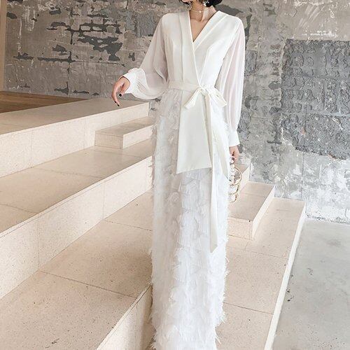 パーティードレス 結婚式 二次会 お呼ばれ パーティー マキシ丈 白 カシュクール Vネック シースルー 長袖 フェザー 大きいサイズ パーティードレス 結婚式 二次会 お呼ばれ パーティー マキシ丈
