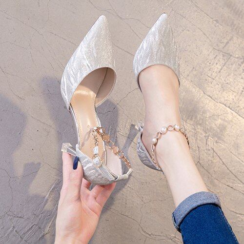 結婚式 パンプス ヒールパンプス ポインテッドトゥ アンクル ストラップ ラメ チェーン エレガント 結婚式用 パーティ 二次会 大きいサイズ 結婚式 パンプス ヒールパンプス ポインテッドトゥ