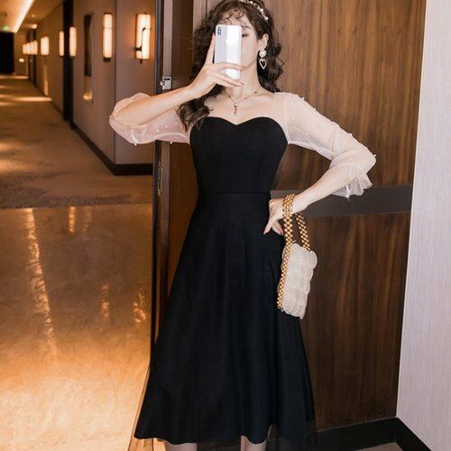 パーティードレス 結婚式 二次会 お呼ばれ パーティー ミモレ丈 ワンピース Aライン シフォン ボリューム袖 異素材 大きいサイズ パーティードレス 結婚式 二次会 お呼ばれ パーティー ミモレ丈
