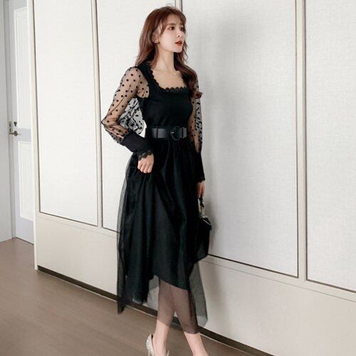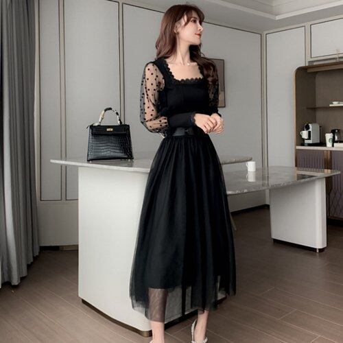パーティードレス 結婚式 二次会 お呼ばれ パーティー ミモレ丈 セットアップ シースルー ドット柄 スクエアネック 長袖 レース パーティードレス 結婚式 二次会 お呼ばれ パーティー ミモレ丈