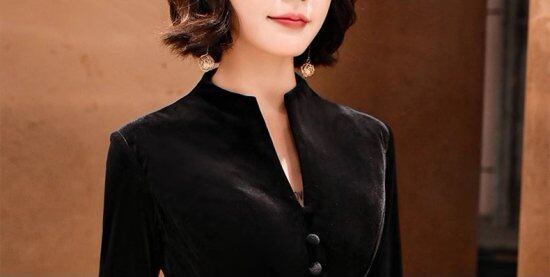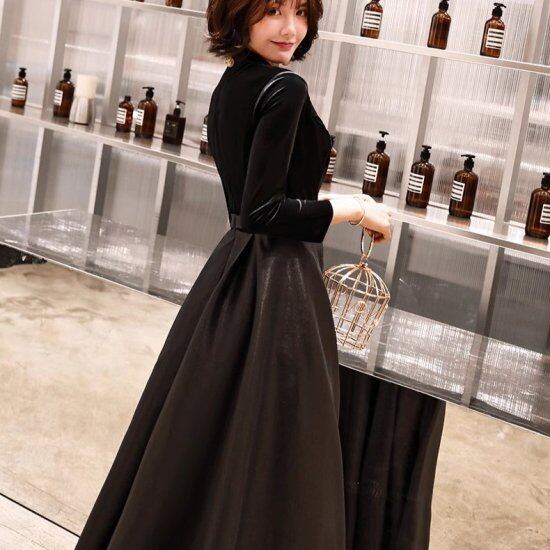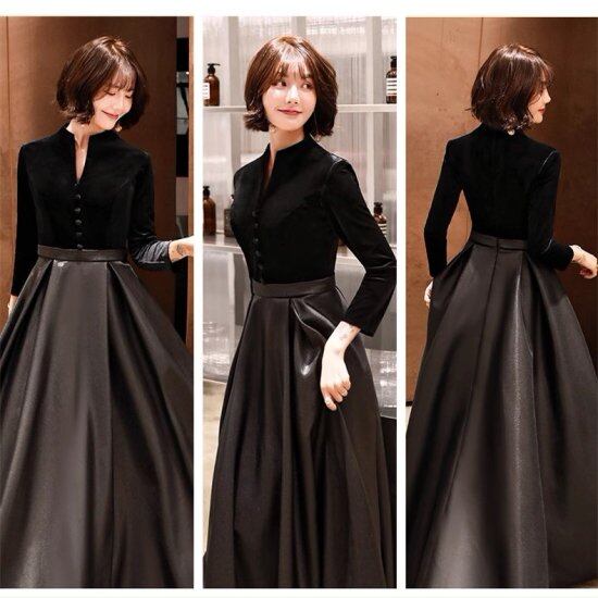 演奏会ドレス レディース ロングドレス スタンドカラー 長袖 九分袖 ベルベット 異素材MIX キーネック ハイウエスト マキシ丈 結婚式 二次会 謝恩会 パーティー イブニングドレス エレガント