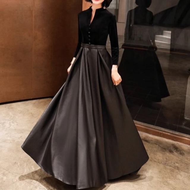 演奏会ドレス レディース ロングドレス スタンドカラー 長袖 九分袖 ベルベット 異素材MIX キーネック ハイウエスト マキシ丈 結婚式 二次会 謝恩会 パーティー イブニングドレス エレガント
