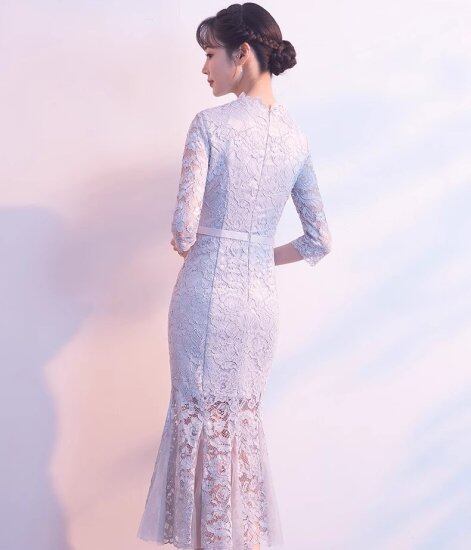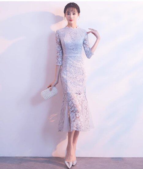結婚式ドレス レディース マーメイド レースワンピース 刺繍 レース 七分袖 ノーカラー 総レース ミモレ丈 スリム タイト 演奏会 二次会 披露宴 謝恩会 パーティー イブニングドレス エレガント