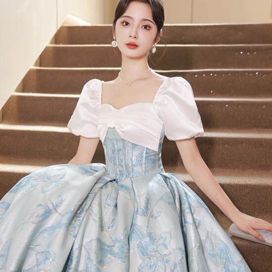 演奏会ドレス レディース パフスリーブ プリンセス リボン バイカラー ツートーン ボリューム ロングドレス マキシ丈 結婚式 カラードレス パーティードレス イブニングドレス かわいい エレガント
