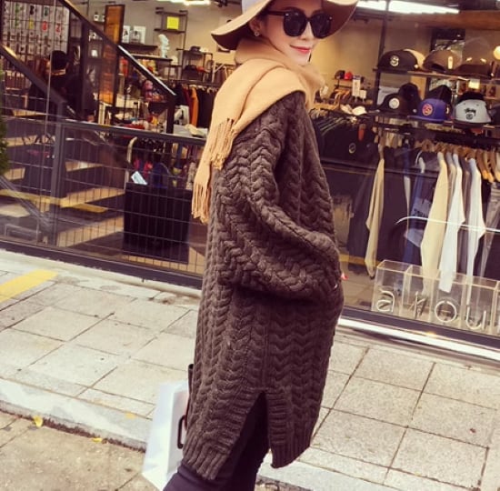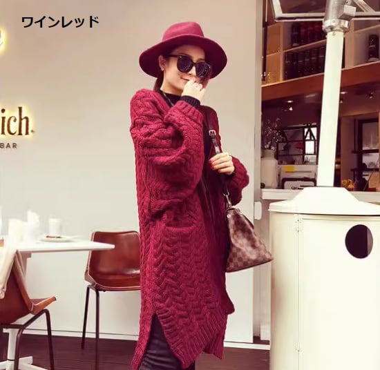 ニットカーディガン レディース アウター 羽織 カーディガン コーディガン ミドル丈カーディガン ゆったり ルーズシルエット ケーブル編み サイドスリット シンプル 無地 カジュアル お出かけ 秋冬