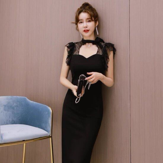結婚式ドレス レディース タイトワンピース レーススリーブ チョーカー風 リボン Vネック ハートネック ノースリーブ ミモレ丈 スリム 演奏会 二次会 披露宴 謝恩会 パーティー エレガント