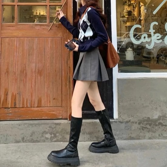 ロングブーツ レディース 厚底ブーツ サイドファスナー フェイクレザー エコレザー ミドルヒール 5cmヒール ラウンドトゥ 黒 シンプル 歩きやすい 脚長 ロング丈 厚底 カジュアル おしゃれ