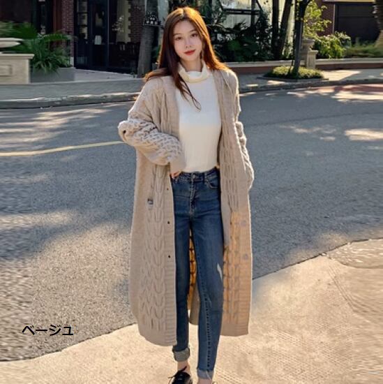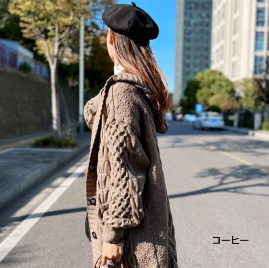 ニットカーディガン レディース アウター 羽織 ロングカーディガン 長袖 ロング丈 カーディガン フード付き フロントボタン 総柄模様 ゆったり 厚手 秋冬 カジュアル お出かけ おしゃれ 女性