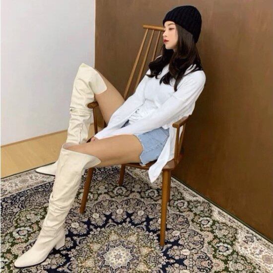 ニーハイブーツ レディース ロングブーツ シャーリング ポインテッドトゥ ひざ上 ハイヒール 7cmヒール 太ヒール ロング丈 フェイクレザー エコレザー ストレッチ サイドファスナー おしゃれ