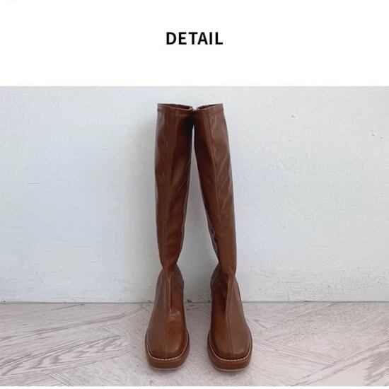 ロングブーツ レディース 厚底ブーツ スクエアトゥ 太ヒール チャンキーヒール ハイヒール 7.5cmヒール フェイクレザー エコレザー スリム ステッチ きれいめ カジュアル おしゃれ 靴 ブーツ